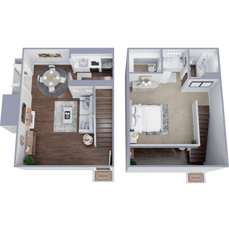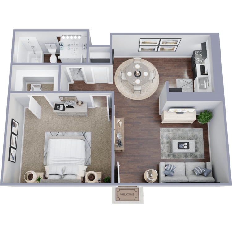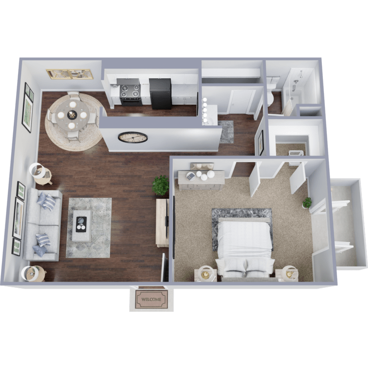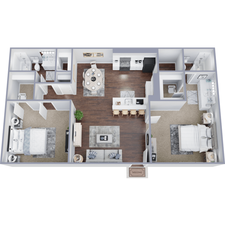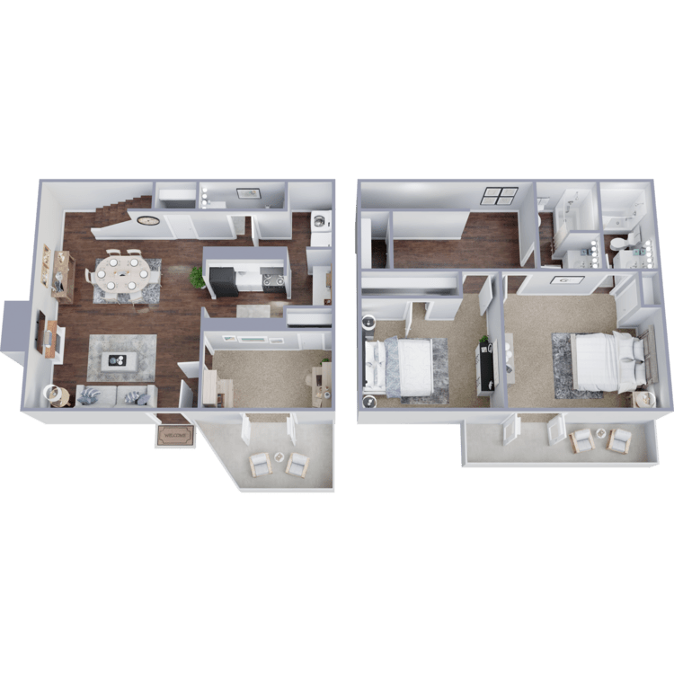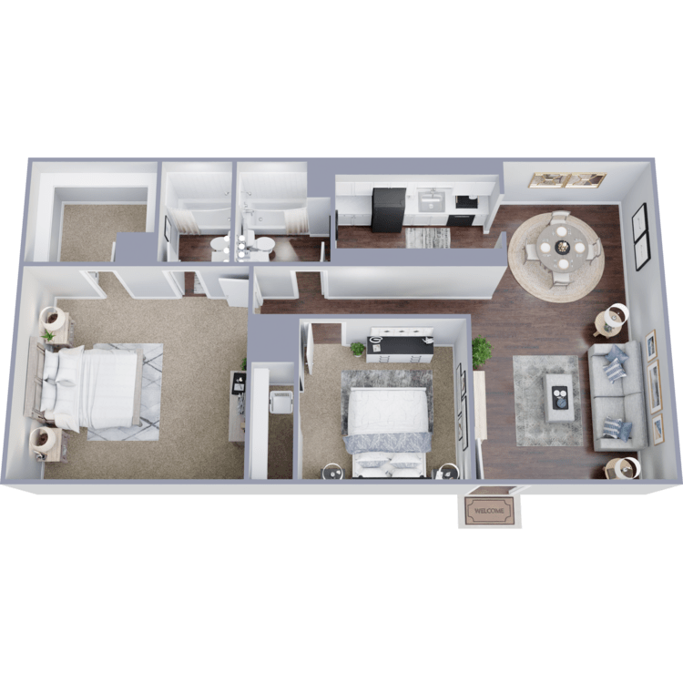 Our apartments for rent offer seven inviting one, two, and three-bedroom floor plans, designed to pair spacious interiors with contemporary finishes. Each kitchen features sleek black appliances, white cabinetry, a refrigerator, and a dishwasher for effortless dining at home. Start the day outdoors on your balcony or patio, or relax by a glowing fireplace in select residences. Every detail enhances how you live, from elegant wood-style flooring and expansive walk-in closets to ceiling fans and washer and dryer connections.